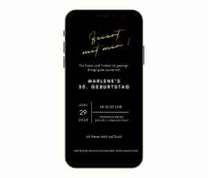 Unsere eCard Geburtstag „Feiert mit mir“ ist eine edle und animierte digitale Einladungskarte, die perfekt für jeden besonderen Anlass geeignet ist. Die schwarz-goldene Farbgebung verleiht ihr eine elegante und feierliche Note, während der Schriftzug „Feiert mit mir“ in Gold ein Gefühl der Freude und des Gemeinschaftsgefühls vermittelt. Das Beste daran ist, dass die Karte personalisiert werden kann, um sie perfekt an den jeweiligen Anlass und Empfänger anzupassen.